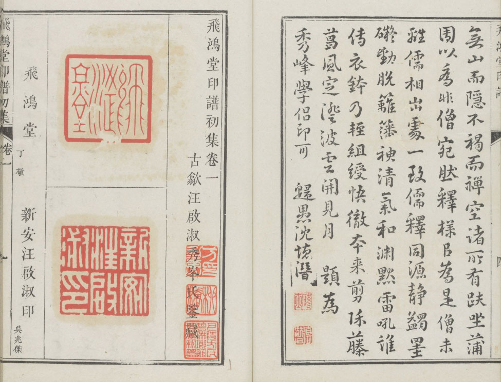 此《飞鸿堂印谱》由清代汪启淑鉴藏,金农、丁敬校定的大型总集式印谱。全书共五集,每集四册、各册二卷,每卷二十五页,每页录二印至四印,共收录印数约为三千五百方,创作者有三百六十多人。附注释文,每集均有作序,首卷有金农题字。此为清乾隆时期歙县汪氏刊本,哈佛大学图书馆藏。